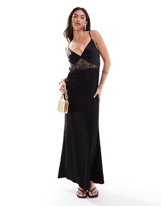 SNDYS – Czarna satynowa sukienka maxi na ramiączkach z koronkowymi wstawkami i odkrytymi plecami