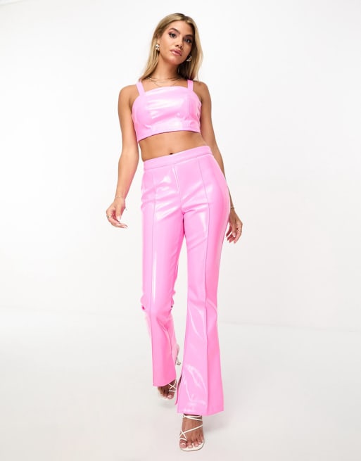 Something New X Flamefaire – Jasnoróżowy winylowy zestaw: krótki top, spodnie z rozszerzanymi nogawkami