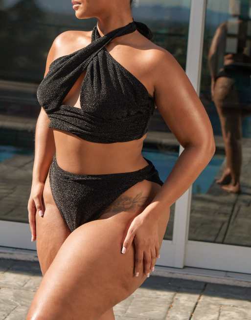 South Beach Curve ft Leslie Sidora Exclusive – Czarny, metaliczny dół od bikini z wysokimi wycięciami