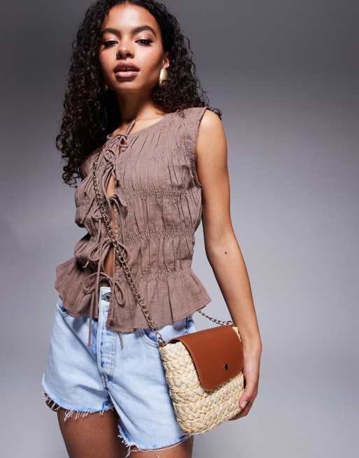 South Beach – Brązowa słomiana torebka crossbody z kontrastową klapką