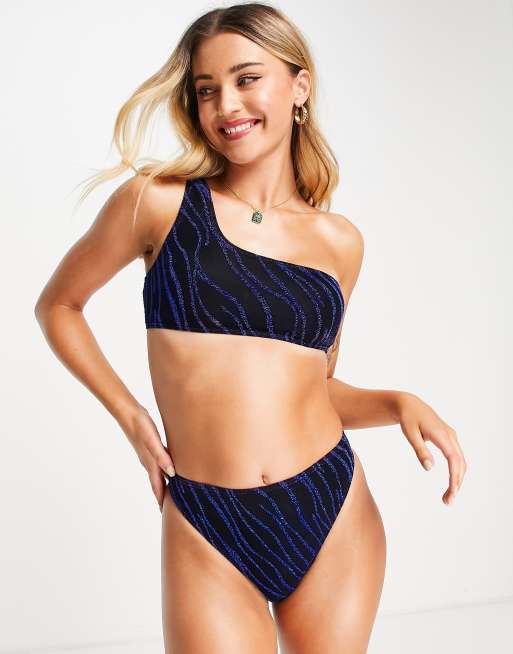 South Beach – Czarno-niebieska zdobiona cekinami góra od bikini na jedno ramię ze wzorem w zebrę