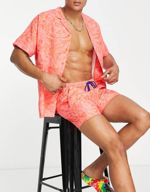South Beach – Czerwono-różowa koszula plażowa we wzór w mazaje