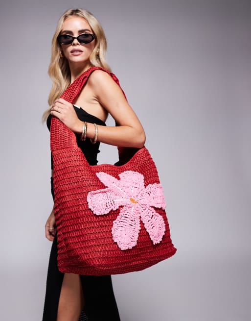 South Beach – Czerwono-różowa szydełkowa torba na ramię z motywem kwiatowym