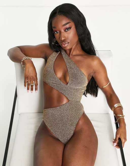 South Beach – Złoty metaliczny strój kąpielowy z asymetrycznym wycięciem