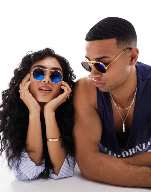 Spitfire – Podwójne okulary przeciwsłoneczne lenonki w złotych oprawkach z niebieskimi lustrzanymi soczewkami