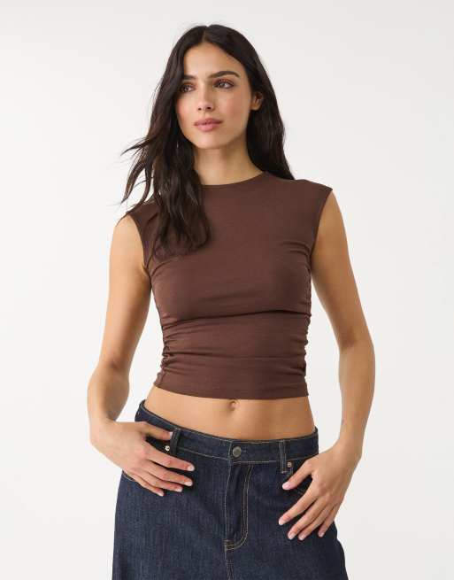 Stradivarius – Basic – Dopasowany brązowy T-shirt z marszczeniem