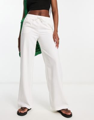 Stradivarius – Białe ściągane na sznurek spodnie z imitacji lnu