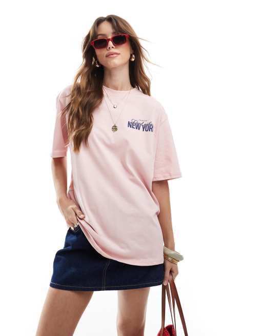 Stradivarius – Bladoróżowy T-shirt oversize z napisem „New York”
