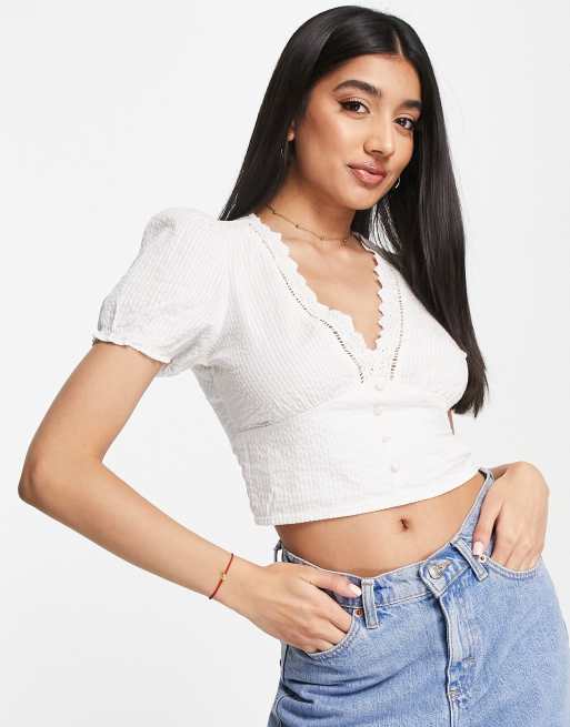Stradivarius – Bluzka w kolorze ecru z koronkowym wykończeniem