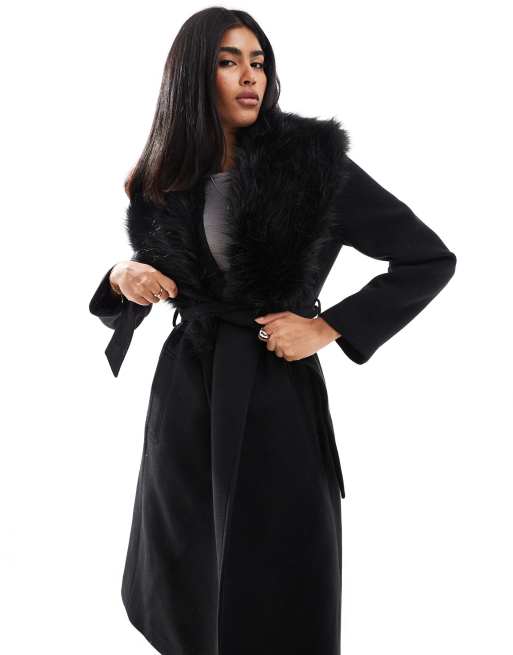 Stradivarius – Czarny długi płaszcz kołnierzem ze sztucznym futrem