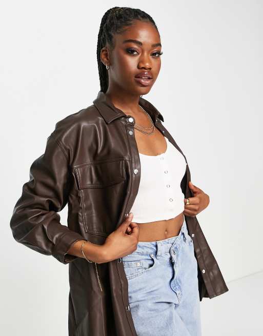 Stradivarius – Czekoladowa kurtka koszulowa z imitacji skóry