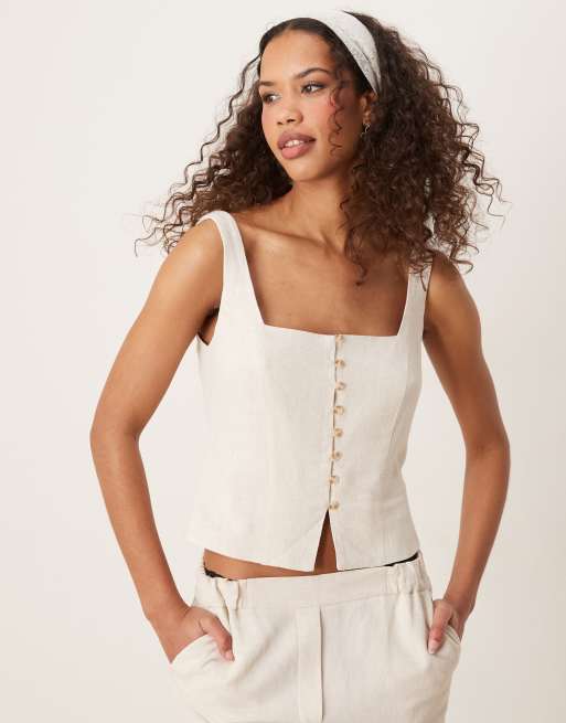 Stradivarius – Dopasowana kamizelka z dekoltem karo o lnianym wyglądzie w kolorze ecru