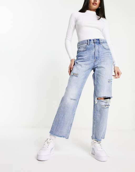 Stradivarius– Jasnoniebieskie jeansy o krótkim fasonie z prostymi nogawkami z przetarciami