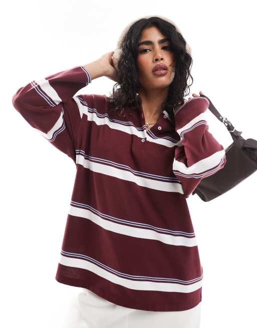 Stradivarius – Koszulka polo oversize w bordowo-białe paski