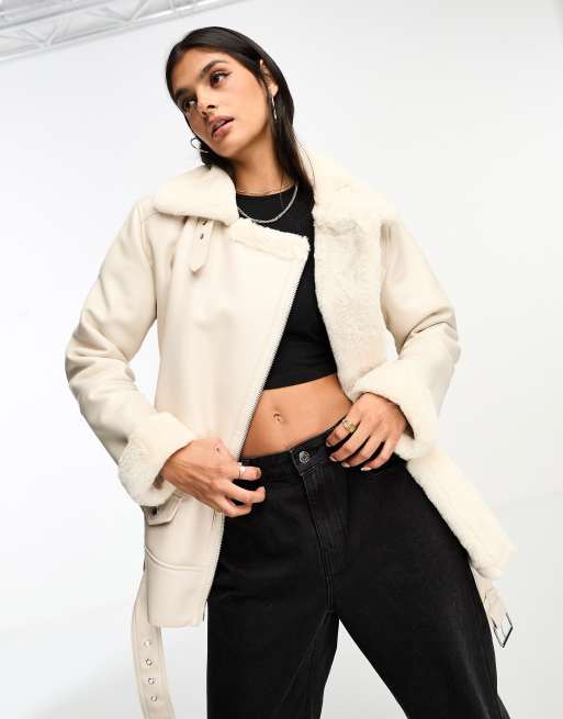 Stradivarius – Kurtka pilotka oversize w kolorze ecru z podszewką z kożuszka