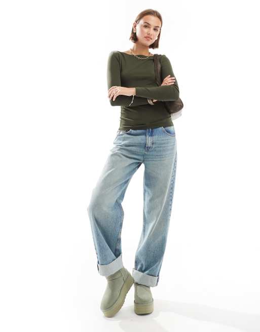 Stradivarius – Marszczony top w kolorze khaki z dekoltem w łódkę