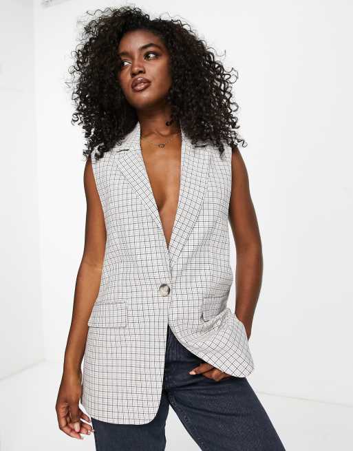 Stradivarius – Niebieska lniana kamizelka oversize w kratę