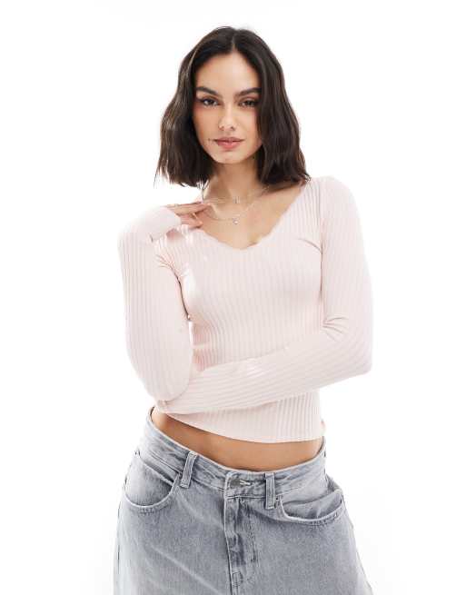 Stradivarius – Różowy dżersejowy top z dekoltem w kształcie litery V i długim rękawem