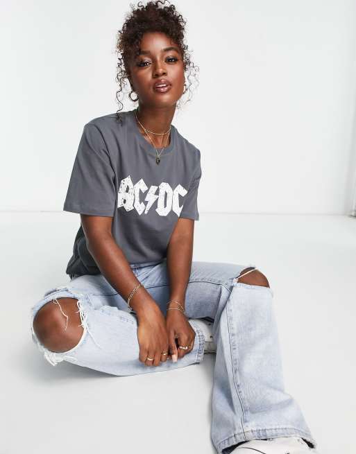 Stradivarius – Szary T-shirt oversize z napisem „AC/DC” z efektem sprania