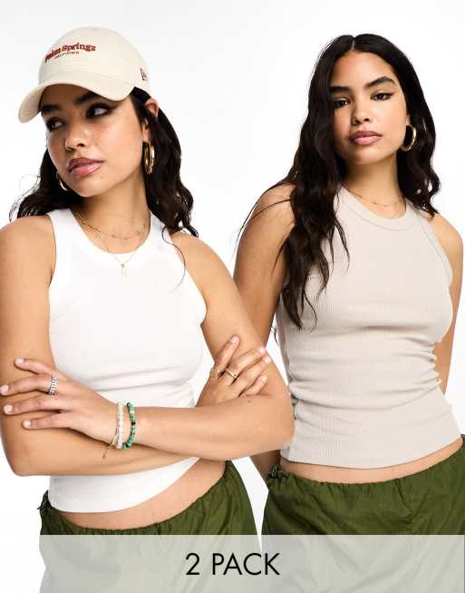 Stradivarius – Zestaw 2 prążkowanych podkoszulków w kolorach kamiennobeżowym i białym