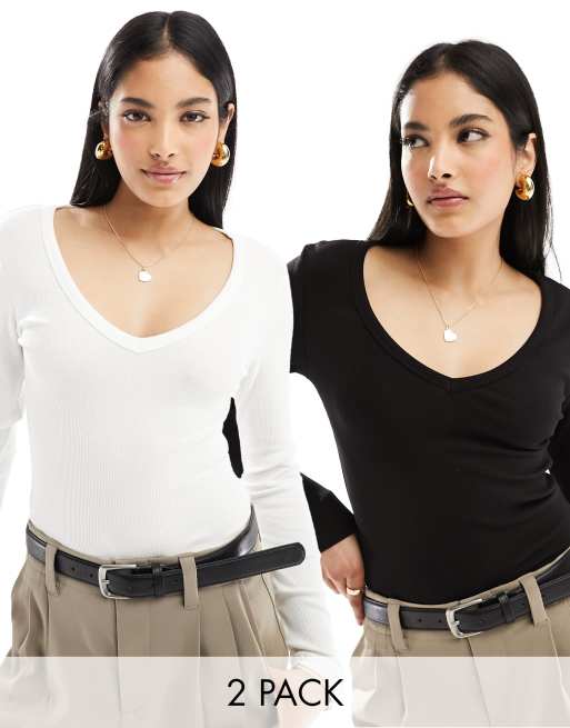 Stradivarius – Zestaw 2 prążkowanych topów z długimi rękawami i dekoltem w szpic w kolorach ecru i czarnym