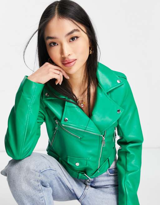 Stradivarius – Zielona kurtka w stylu motocyklowym z imitacji skóry