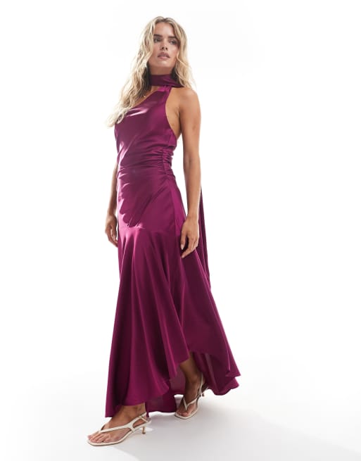 TFNC Petite – Bridesmaid – Asymetryczna satynowa sukienka maxi z szalem w śliwkowym kolorze