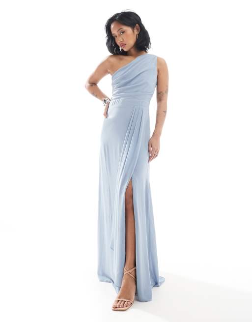 TFNC Petite Bridesmaid – Szaroniebieska szyfonowa sukienka maxi z kopertową spódnicą