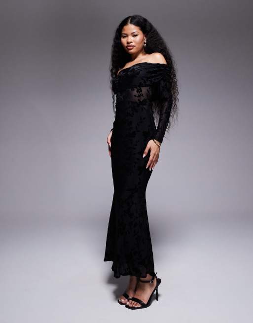 TFNC Petite – Czarna aksamitna sukienka maxi z długimi rękawami i odkrytymi ramionami we wzór devoré