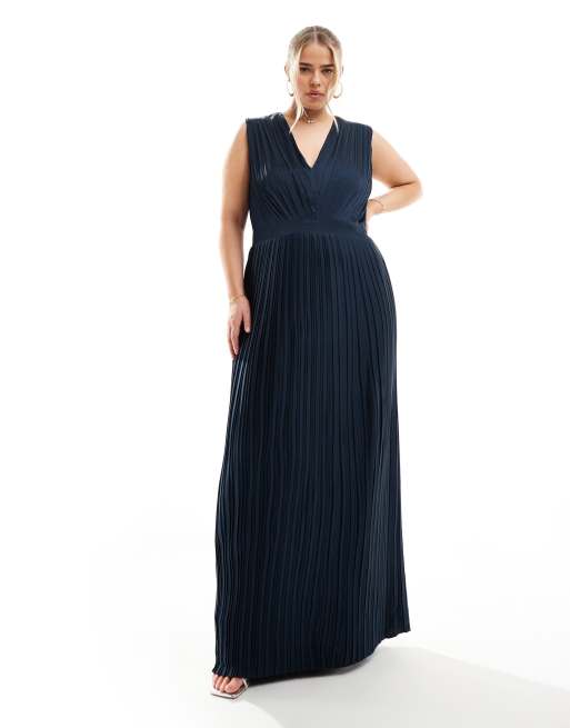 TFNC Plus Bridesmaid – Granatowa plisowana satynowa sukienka maxi