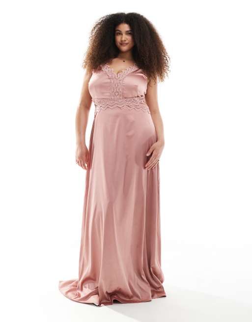 TFNC Plus Bridesmaid – Satynowa sukienka maxi w zgaszonym różowym kolorze z muszelkową koronką