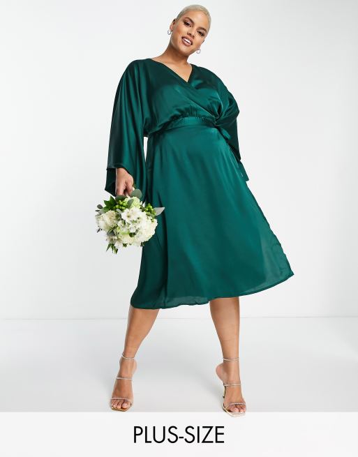 TFNC Plus Bridesmaid – Szmaragdowozielona, kopertowa sukienka satynowa midi z kimonowymi rękawami