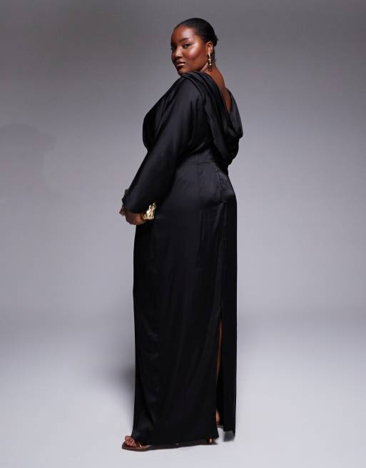 TFNC Plus – Czarna satynowa sukienka maxi z długim rękawem i drapowanym tyłem