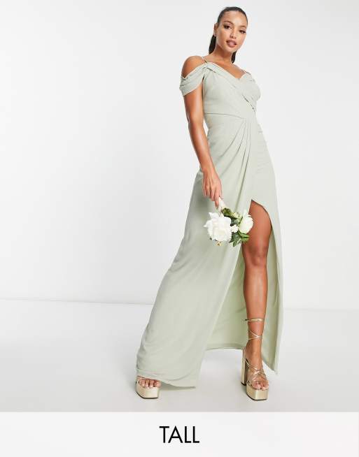 TFNC Tall Bridesmaid – Szałwiowozielona sukienka kopertowa z drapowaniem na ramionach