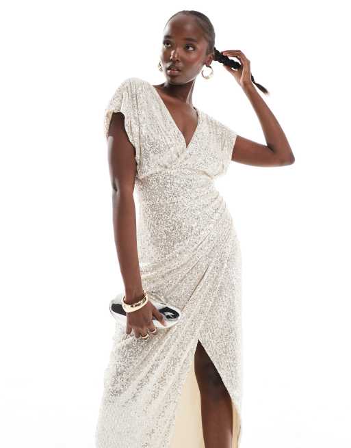 TFNC Tall – Srebrna cekinowa sukienka kopertowa maxi
