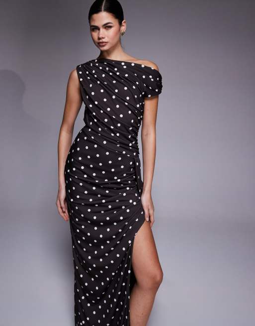 TFNC – Czekoladowa sukienka maxi na jedno ramię z odkrytym ramieniem w groszki