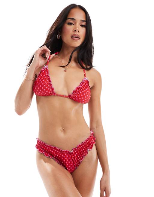 The Frolic Exclusive – Czerwona góra od bikini z dekoltem halter, kontrastowym karbowanym wykończeniem i wzorem w różowe groszki, część zestawu