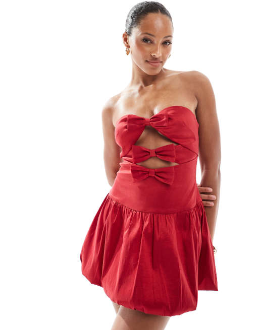 The Frolic Exclusive – Czerwona, satynowa sukienka mini z dekoltem bandeau, wycięciami, kokardkami i dołem o fasonie bombki