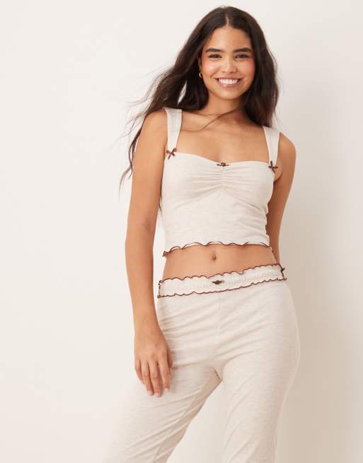 The Frolic Exclusive – Krótki top od piżamy w melanżowym owsianym kolorze z marszczeniem na biuście i kontrastowym karbowanym wykończeniem, część zestawu