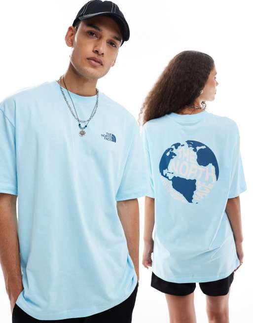 The North Face – Jasnoniebieski T-shirt oversize z nadrukiem kuli ziemskiej na plecach