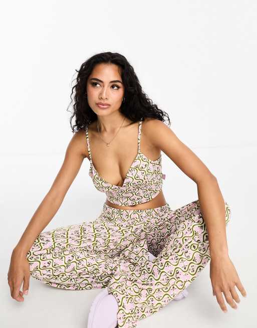 Wellness Project × Chelsea Peers – Liliowa piżama w mozaikowy wzór retro: braletka i spodnie z szerokimi nogawkami