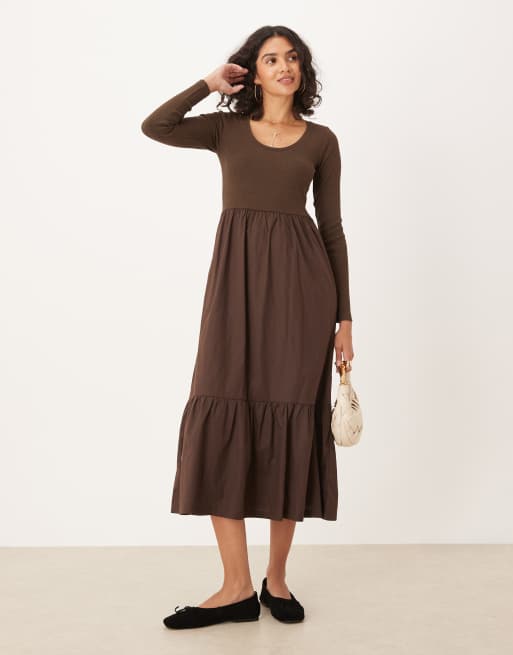 Threadbare – Brązowa sukienka midi z długimi rękawami, dekolt w kształcie litery U i popelinową spódnicą