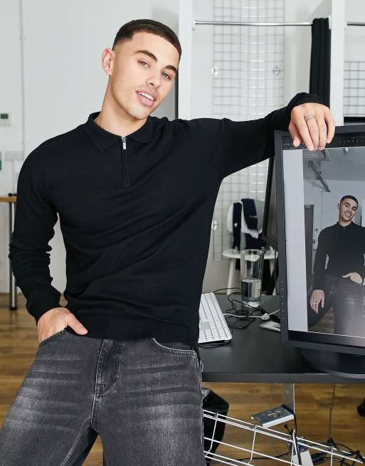Threadbare – Czarna koszulka polo z dzianiny bawełnianej z długimi rękawami i suwakiem pod szyją