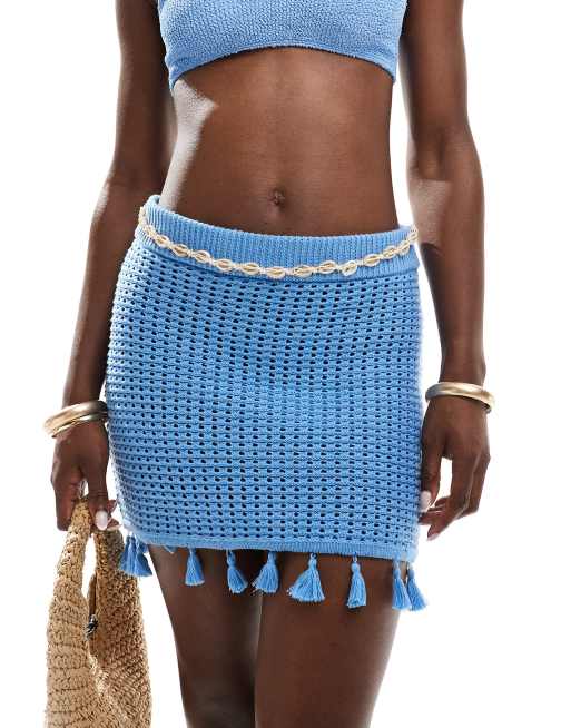 Threadbare – Jasnoniebieska szydełkowana spódnica mini z frędzlami