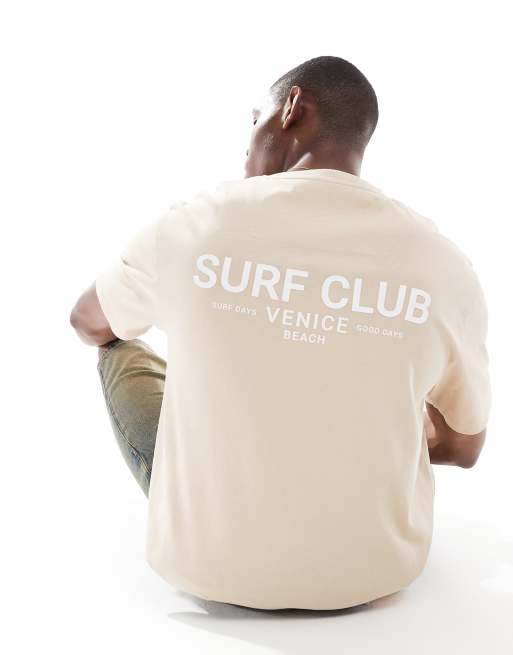 Threadbare – Kamiennobeżowy T-shirt z okrągłym dekoltem i nadrukiem surfingowym na plecach