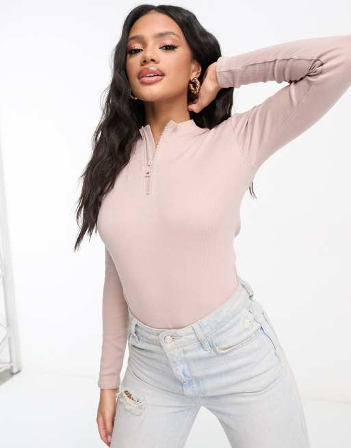 Threadbare – Szarobrązowe prążkowane body z długimi rękawami, wysokim dekoltem i suwakiem pod szyją