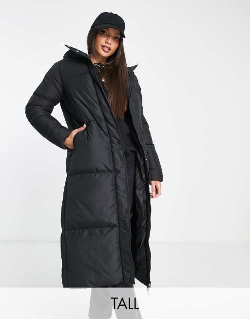 Threadbare Tall – Jodie – Czarny ocieplany płaszcz maxi z kapturem