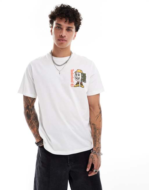 Timberland – Biały T-shirt oversize z małym logo z grafiką ludzika w butach