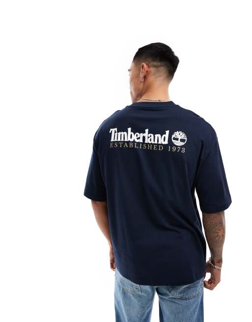 Timberland – Granatowy T-shirt oversize z dużym logo na plecach