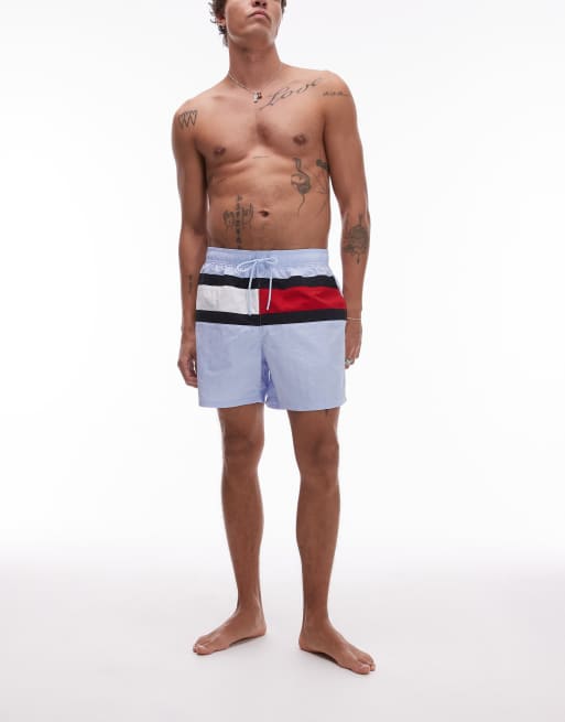 Tommy Hilfiger – Bladoniebieskie, ściągane na sznurek szorty kąpielowe z dużym logo z flagą